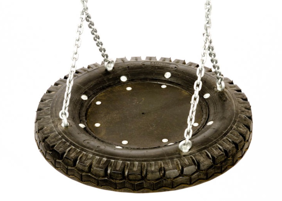 Speziell hergestellter PKW Reifen in der Mitte längs aufgeschnitten. Mit montierter Sitzplatte. Durchmesser ca. 60 cm. Kettenbefestigung mittels 4 Stück M8 Gewindebolzen für Ketten mit Ringmuttern. PAK frei. TÜV zertifiziert nach EN1176.