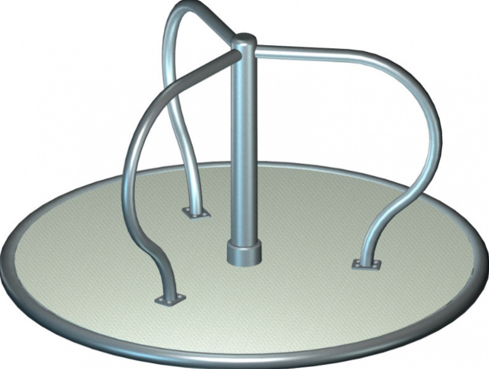 Aus pulverbeschichtetem Stahlrohr. Boden aus stabilen Aluminiumriffelblech. Inklusive Erdanker zum einbetonieren. Mit hochwertigen Wälzlagern für lange Lebensdauer. Benötigte Installationsfläche: 530 x 530 cm bei Ø ca. 130 cm, Höhe ca. 71 cm. Tüv zertifiziert nach EN 1176 für den Einsatz im öffentlichen Bereich.