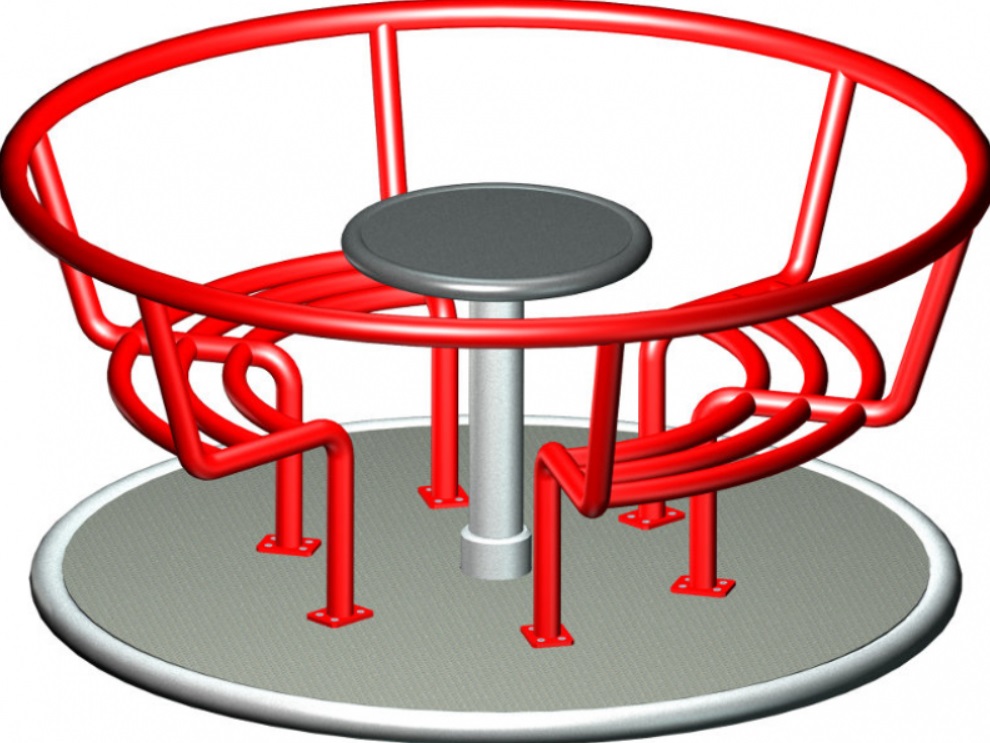 Karussel Durchmesser ca. Ø 140 cm. Inklusive Erdanker zum einbetonieren. Durch drehen am Lenkrad wird das Karussell in Bewegung gesetzt. Boden aus 2 mm Aluminiumriffelblech, Sitzflächen aus Stahlrohr, pulverbeschichtet. Mit hochwertigen Wälzlagern für lange Lebensdauer. Benötigte Installationsfläche 540 x 540 cm. Tüv zertifiziert nach EN 1176 für den Einsatz im öffentlichen Bereich.
