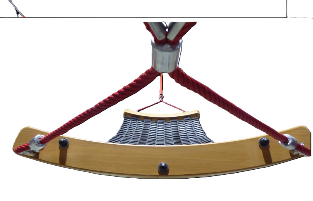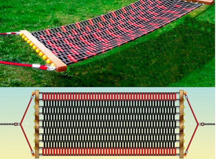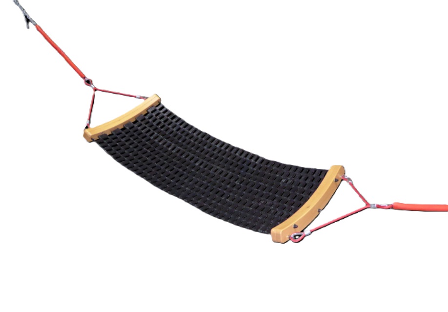 Robuste Hängematte DIN EN 1176, für Kindereinrichtungen, öffentliche Spielplätze und den privaten Garten. Maße: 1950mm x 800 mm. Geflecht aus Kunststofflamellen auf PVC überzogenem Stahlseil. Seilaufhängung aus Seil und Kette. Standardfarbe: rot/schwarz. Ohne Standpfosten.