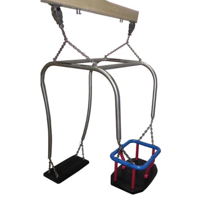 Schaukelspaß von Angesicht zu Angesicht. Abmessungen: H115xB70xT90cm. Tüv zertifiziert nach DIN EN1176. Rohrrahmen aus Edelstahlrohr. Ausgestattet mit 1 Stück flachem Schaukelsitz für einen Erwachsenen, 1 Stück Kleinkinderschaukelsitz. Inklusive Ø 6 mm Edelstahlaufhängekette zur Montage an einen 2,50m Kopfbalken. Ohne Schaukelgehänge (Schaukelgelenke).